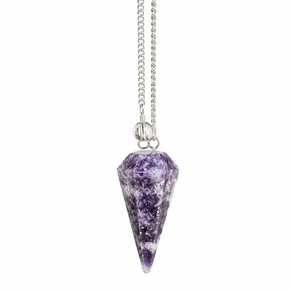 Et smukt og balanceret lepidolit pendul med bjergkrystal kugle, skabt til dig der ønsker ro i sindet, klarhed i dine valg og en dybere forbindelse til din intuition.