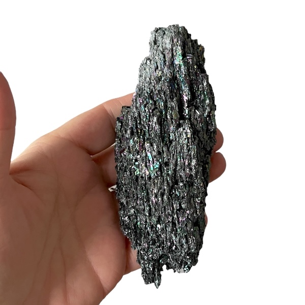 Heksekost er fremstillet af siliciumcarbid, en syntetisk forbindelse af silicium og kulstof, skabt under høj varme. Selvom den ikke er naturligt forekommende i denne form, betragtes den som en værdifuld krystal i spirituelle kredse. Dens regnbueeffekt og metalliske glans gør den til et dragende stykke for både samlere og dem, der arbejder med energi og chakraer.