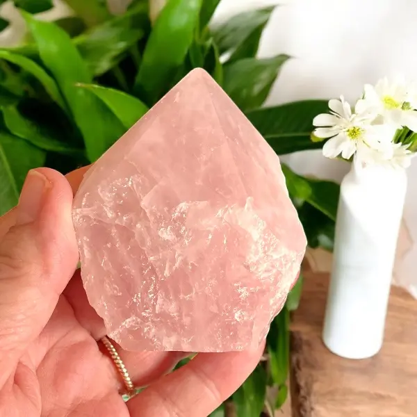 Eksklusiv semipoleret rosenkvarts spids i unika kvalitet – måler 7,5 x 6 cm (B)