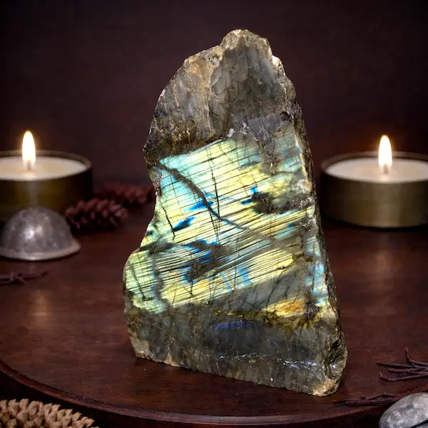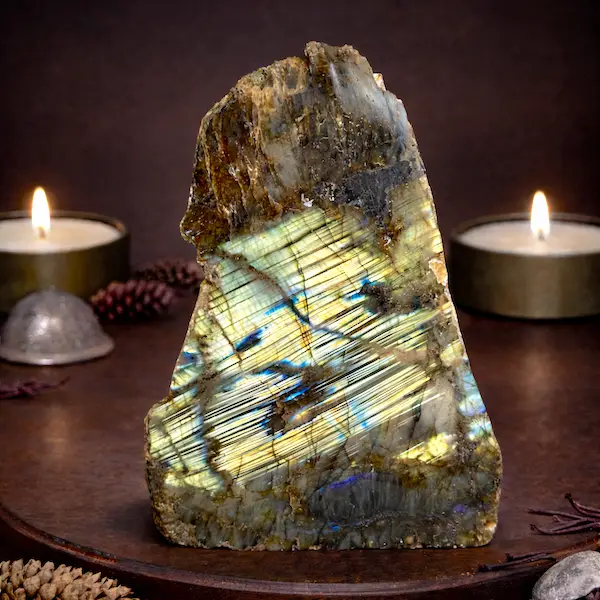 Labradorit absorberer ikke negativ energi – den siges at afvise og beskytte imod den. Derfor er den særligt velegnet til sensitive personer og behandlere.