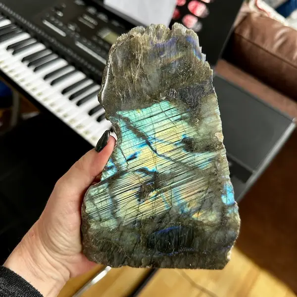 Ingen labradoritter er ens – og denne skive har sin helt egen form, struktur og sit eget farvespil.