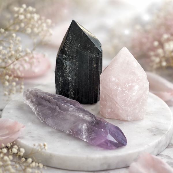 Krystalspids Sæt – Ametyst, Rosenkvarts & Sort Turmalin 🔮