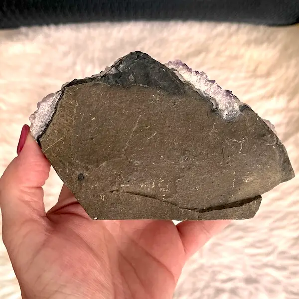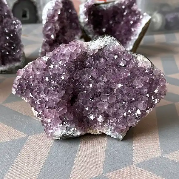 De små, tætliggende druzy-krystaller giver en glitrende overflade, der fanger lyset fra alle vinkler. Den dybe lilla farvetone gør denne klynge til et elegant valg, uanset om du bruger den til energi, healing eller som en dekorativ perle i indretningen.