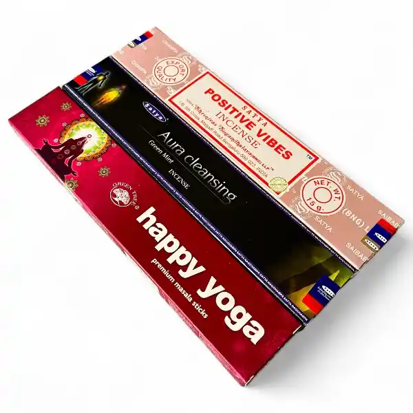 Oplev Aura Balance, en eksklusiv spirituel røgelsespakke med tre håndrullede premium røgelsespinde, der kombinerer velvære, spiritualitet og aromaterapi. Denne unikke samling indeholder Happy Yoga, Satya Positive Vibes og Satya Aura Cleansing med grøn mint, hver med sin egen karakteristiske duft og spirituelle egenskaber.