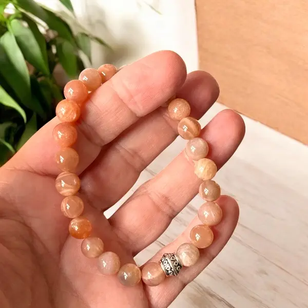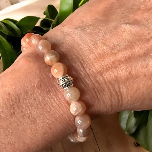 Armbåndet er fremstillet med 8 mm runde perler af den fineste solsten. Solsten er kendt for sin varme, glitrende overflade og smukke gyldne glød, som fanger lyset på magisk vis. Denne sten forbindes med glæde, livskraft og positiv energi – og bringer lys og varme ind i hverdagen.