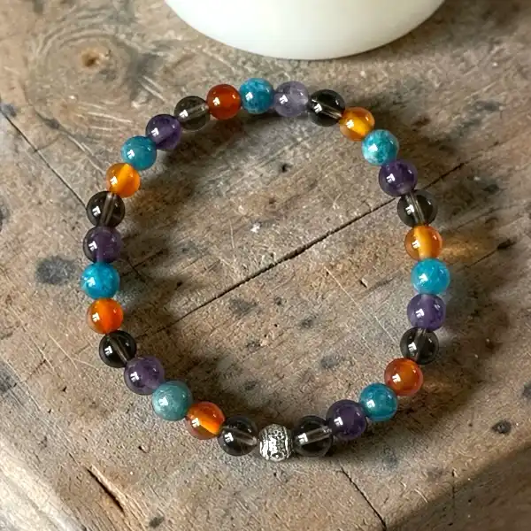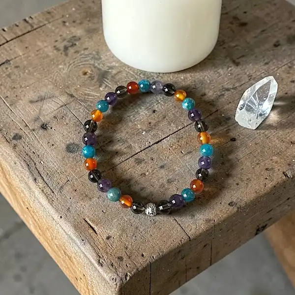 Støttearmbånd til smertelindring – med blå apatit, karneol, røgkvarts og ametyst 💜
