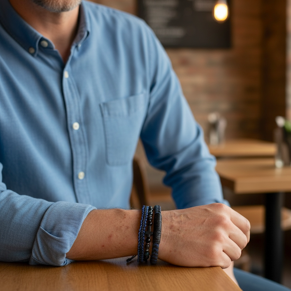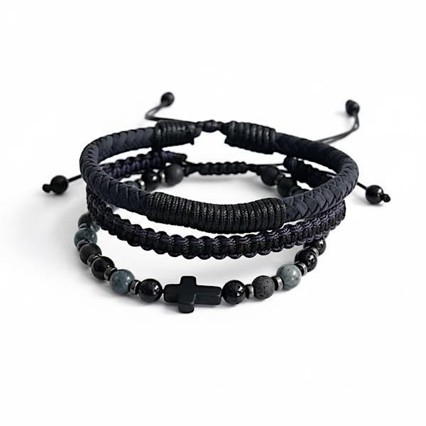 Når alle tre armbånd bæres samlet, skaber de et råt og kraftfuldt udtryk med tydelig maskulin energi. Ét armbånd alene giver et mere enkelt og minimalistisk look, mens to armbånd skaber en afbalanceret stil med dybde og struktur. Uanset hvordan de bæres, bevarer Midnight Cross sit gennemførte og harmoniske udtryk.