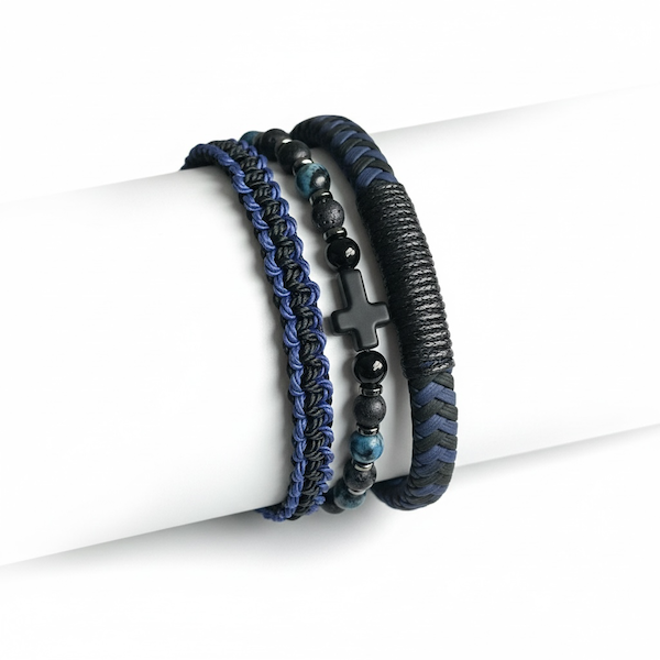 Midnight Cross er et markant og maskulint 3-i-1 herrearmbånd skabt til manden, der ønsker et råt, moderne og tidløst smykke med dybde og karakter. Armbåndssættet kombinerer lavasten, sort onyx, blå dumortierit samt et kors-charm i rustfri stål, hvilket giver et kraftfuldt og balanceret udtryk i sort og blå nuancer.