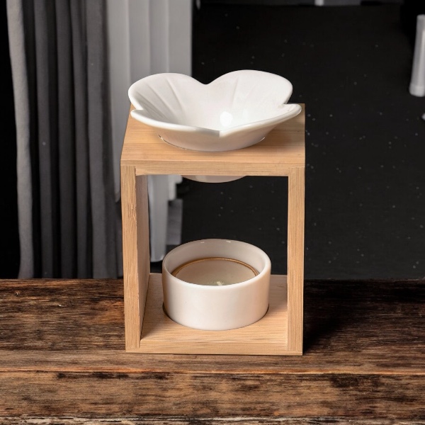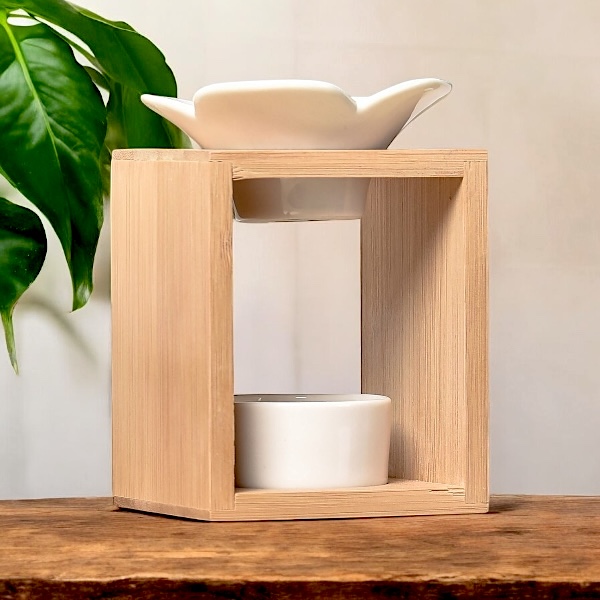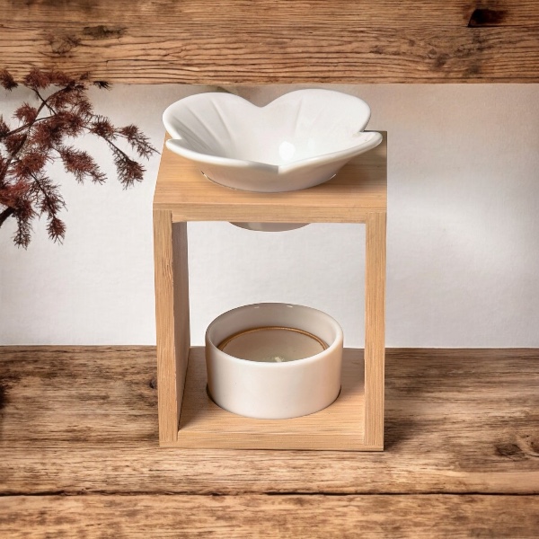 Håndlavet Aromalampe i Bambus med Plumeria/frangipani Blomst i hvid porcelæn– Skab en Fredfyldt Atmosfære i Dit Hjem ❤️