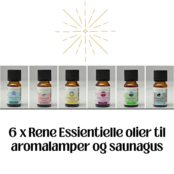 Oplev et eksklusivt sæt med 6 forskellige æteriske olier, og gratis opbevaringstaske - perfekt til aromalamper, saunagus og duftsten ❤️
