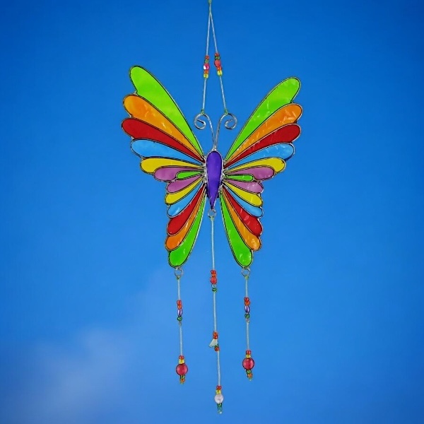 Denne håndlavede solfanger i form af en sommerfugl er ikke bare en dekoration – det er et farveorgie, der bringer liv og glæde ind i dit hjem. Med sine smukke regnbuefarver fanger den solens stråler og spreder et glitrende spil af lys og farver i rummet. Solfangeren har en totallængde på ca. 32 cm selve sommerfuglen måler 13 x 17 cm og er perfekt til at hænge i et vindue, hvor den kan få fuld udnyttelse af sollyset.