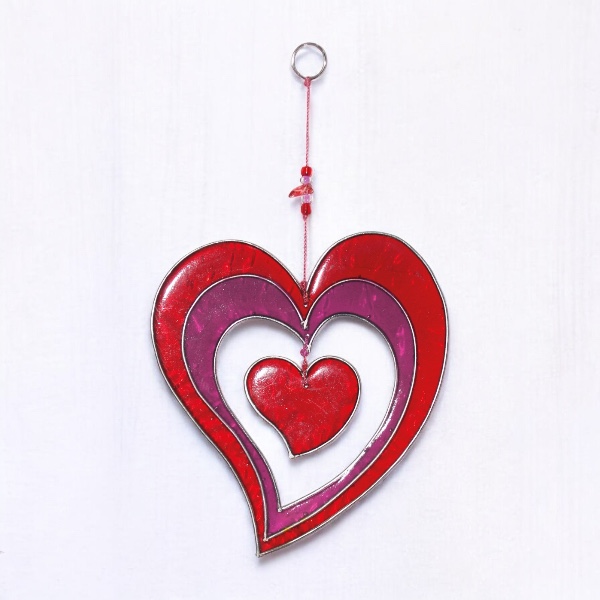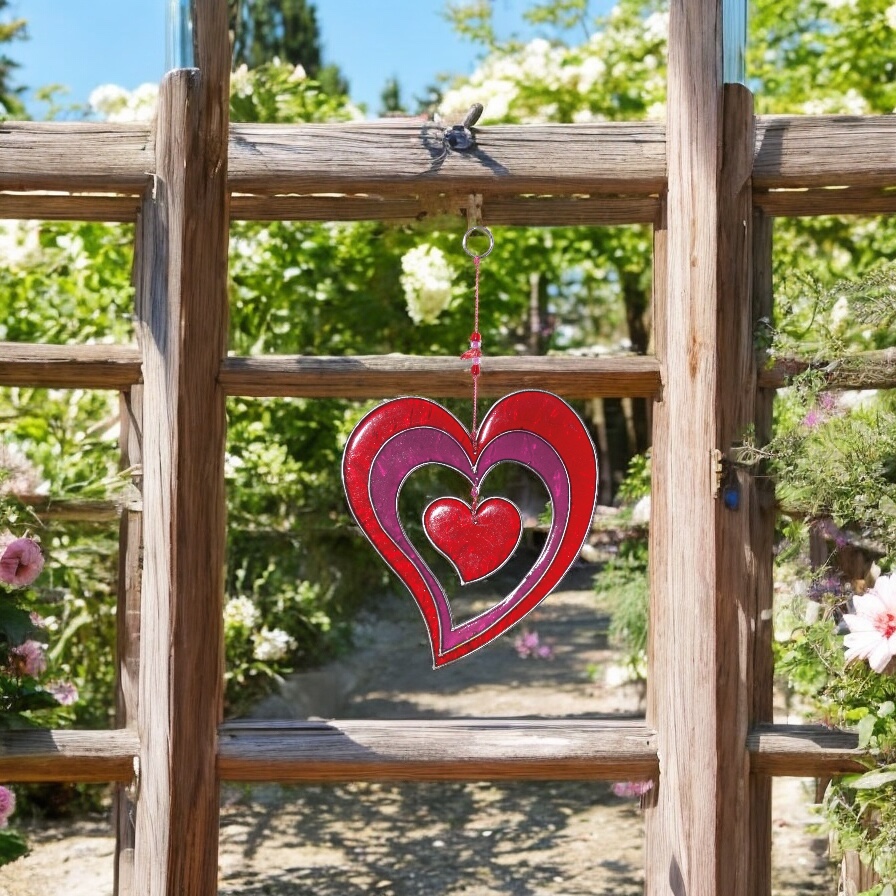 Denne elegante solfanger er formet som et smukt dobbelthjerte og håndlavet i resin og metal. Den kombinerer varme røde og dybe violette farver i et harmonisk design, der taler til både hjertet og øjet. Farverne spiller smukt sammen, når sollyset rammer materialet, og skaber en levende glød, der forandrer stemningen i rummet.