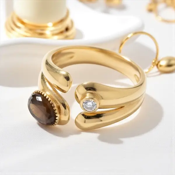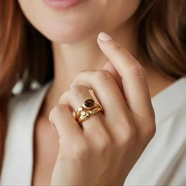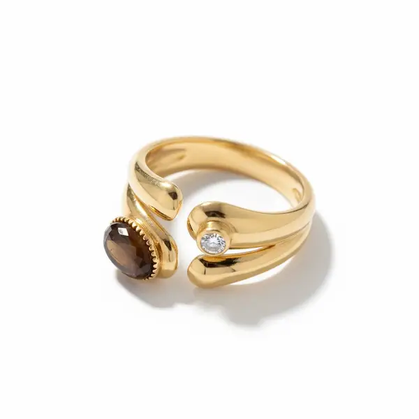 Denne smukke justerbare ring i forgyldt rustfrit stål kombinerer naturens rå energi med et strejf af luksus og sofistikeret design.
