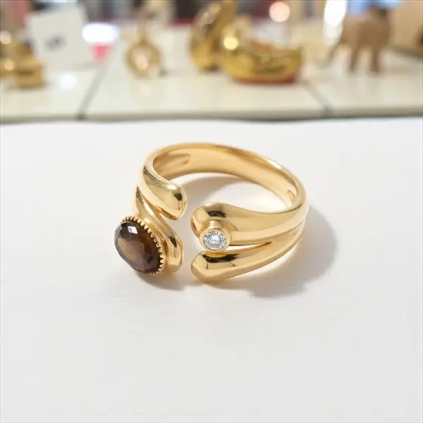 Denne justerbare ring i forgyldt rustfrit stål med Tigerøje og klar rhinsten er designet til dig, der ønsker æstetik med mening.