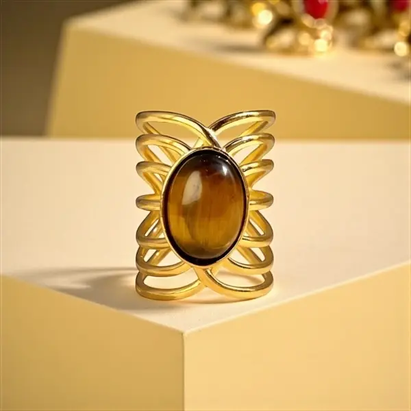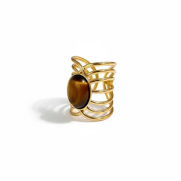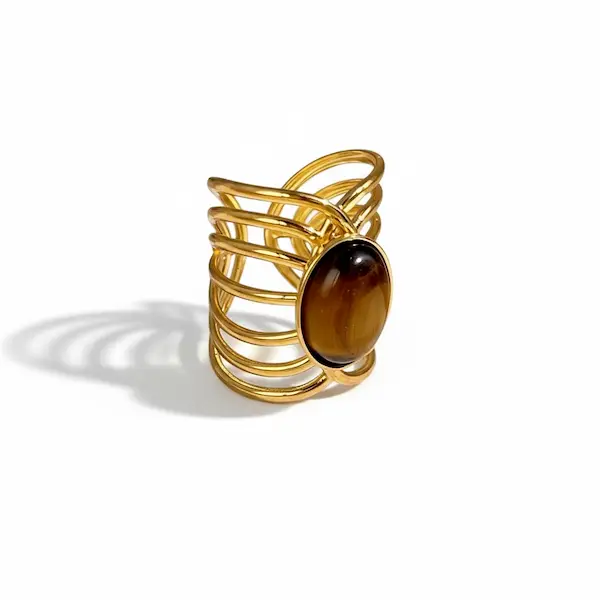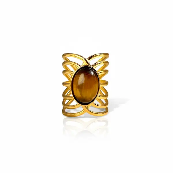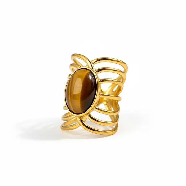 Fremhæv dine hænder med denne justerbare ring i forgyldt rustfrit stål, prydet med en smuk oval Tigerøje-sten. Dens varme gyldne og brune nuancer fanger lyset og tilføjer et sofistikeret og energifyldt udtryk til ethvert look.