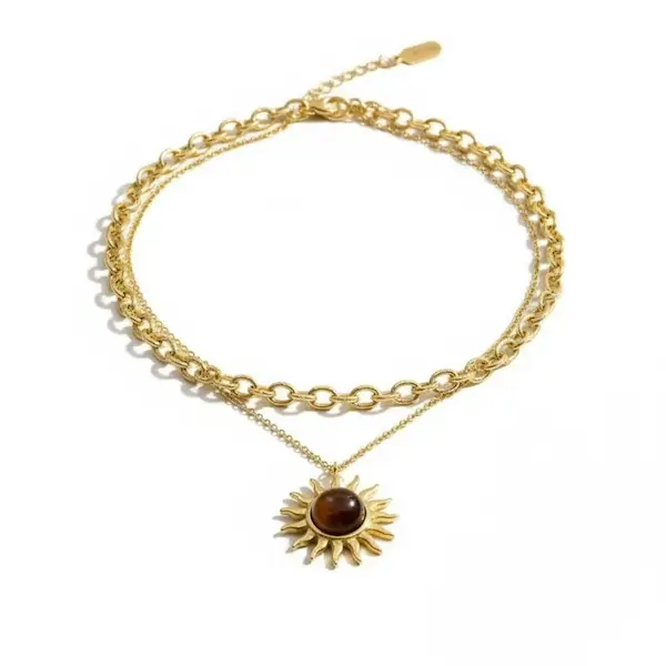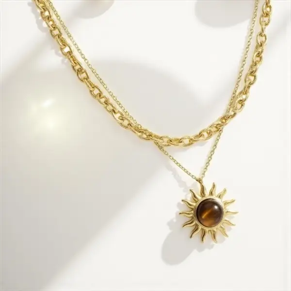 Forgyldt dobbeltkæde med sol og tigerøje – et symbol på styrke og lys ☀️