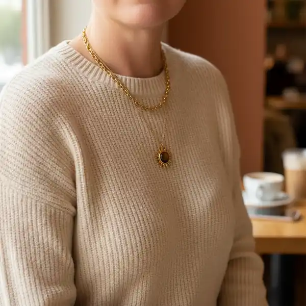 Denne forgyldte dobbeltkæde med sol og tigerøje er mere end blot et smykke – det er en påmindelse om din egen styrke og dit lys. Den er oplagt som gave til dig selv eller en person, du ønsker at løfte og inspirere. Hver gang lyset rammer vedhænget, danser tigerøjets glød som en levende flamme i solen – et billede på håb, energi og mod.