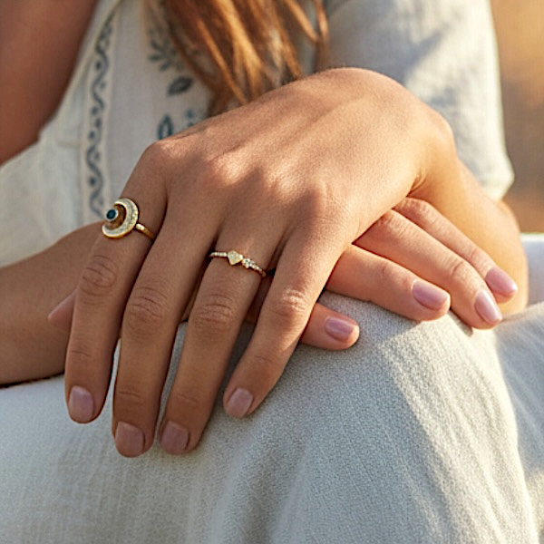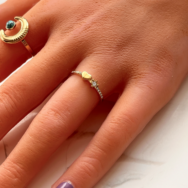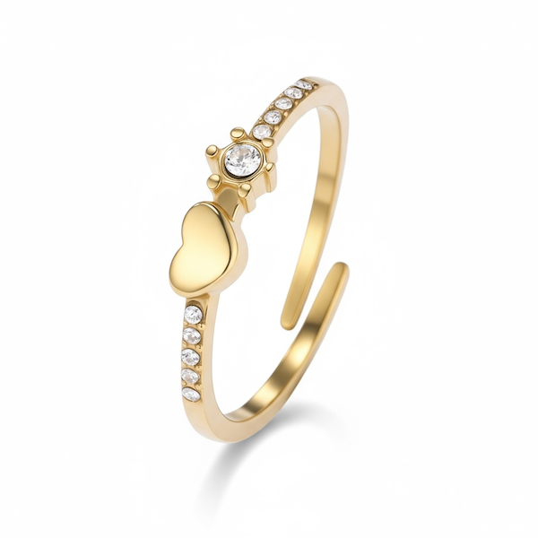 Ringen er udført i holdbart forgyldt stål, som sikrer, at den bevarer sin glans og kvalitet gennem daglig brug. Det lille hjerte symboliserer kærlighed, empati og indre balance, mens de klare rhinsten reflekterer lyset og minder dig om at se det smukke i livet – selv i de små øjeblikke.