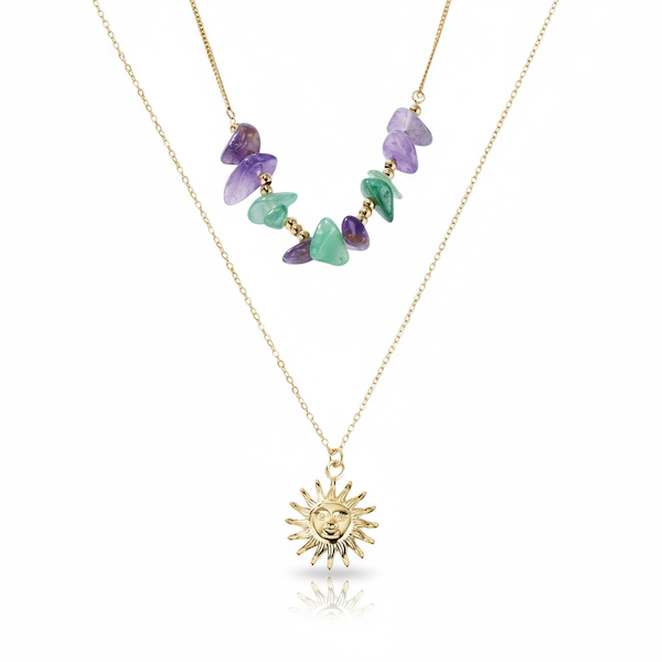 Solen har i tusinder af år været et stærkt symbol på liv, glæde og vitalitet. Når du bærer denne halskæde, bærer du samtidig en påmindelse om at lade dit indre lys skinne. Solen står for styrke, mod og genfødsel – et tegn på, at mørket altid efterfølges af lys. Kombinationen af solens energi og fluorittens spirituelle klarhed gør denne halskæde til en kraftfuld talisman, der løfter både humør og vibration.