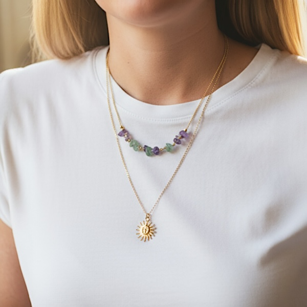 Spirituel halskæde med fluorit og sol – et smykke med lys og energi 💜