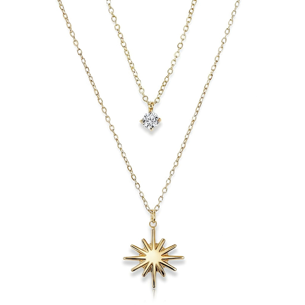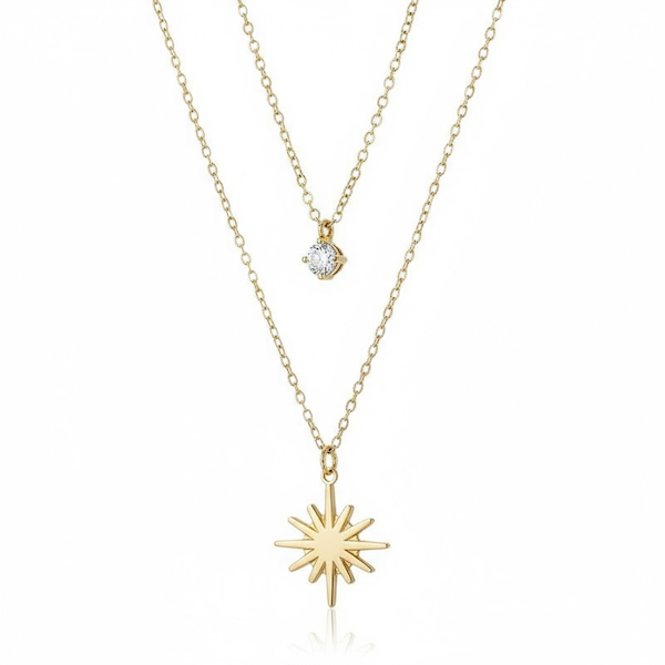 Spirituel dobbelthalskæde i forgyldt stål med stjerne og rund klar rhinsten – symbol på lys og håb ✨