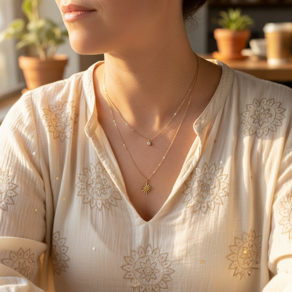Denne dobbelthalskæde repræsenterer lys, styrke og spirituel klarhed. Det runde vedhæng symboliserer helhed, balance og evighed, mens stjernen udstråler håb, vejledning og troen på din indre kraft. Sammen skaber de et smykke, der minder dig om at følge dit lys og bevare troen på dig selv.
