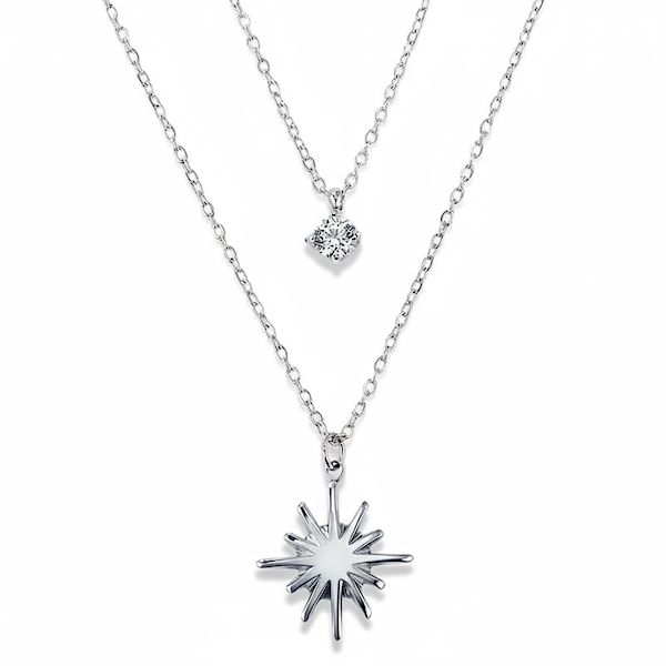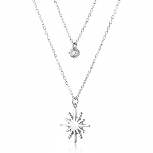 Spirituel dobbelthalskæde i rustfri poleret stål med stjerne og rund klar rhinsten – symbol på lys og håb ✨