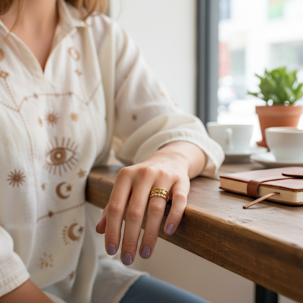 For at bevare forgyldningens skønhed bør du undgå kontakt med vand, parfume og rengøringsmidler. Opbevar ringen tørt, når den ikke bruges, og tør den af med en blød klud efter brug for at bevare dens glans.