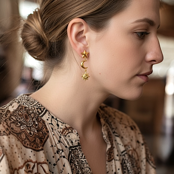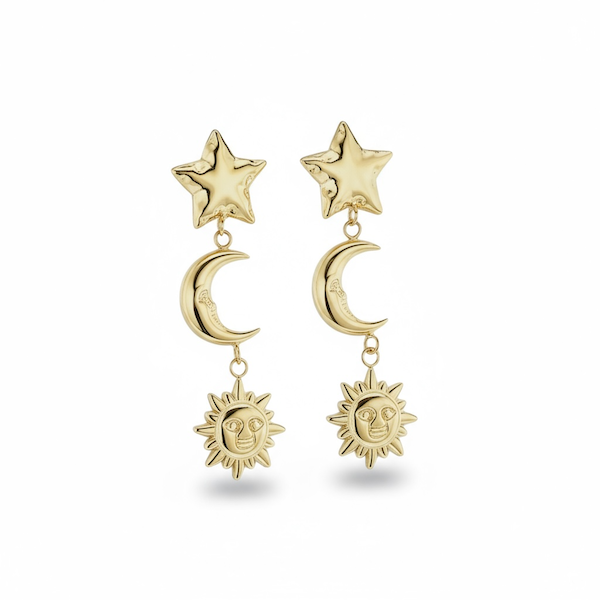 Disse smukke, spirituelle og unikke forgyldte ørestikker med vedhæng forener solens kraft, månens intuition og stjernernes visdom i ét magisk design.