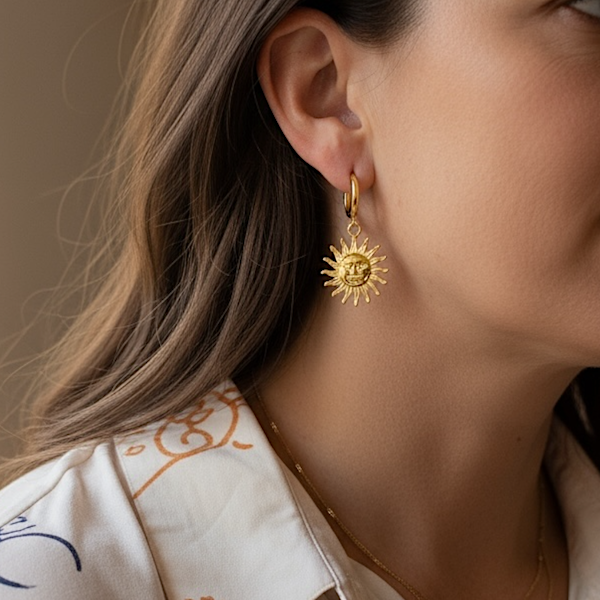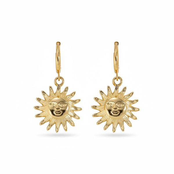 De forgyldte sol-creoler er et tidløst smykke, der passer til enhver stil. De kan bæres alene som statement-smykke eller kombineres med andre guldtoner for et komplet look. Den varme gyldne overflade fremhæver solens symbolik og tilføjer et subtilt strejf af luksus til ethvert outfit.