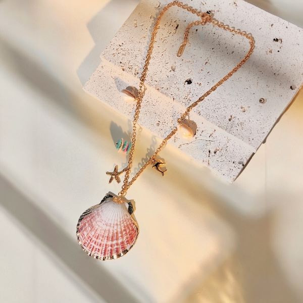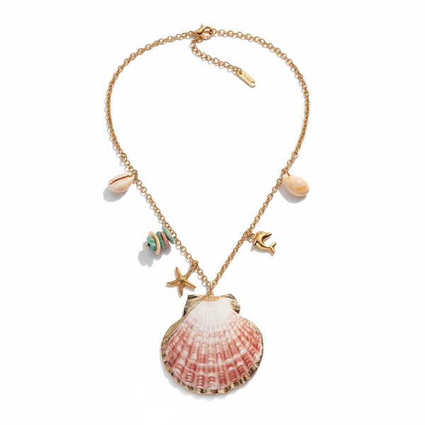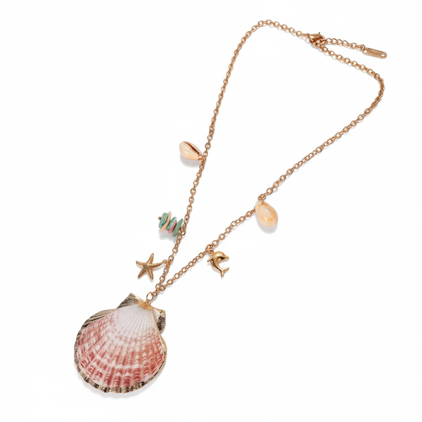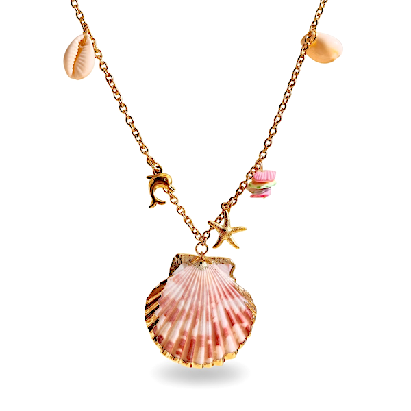 Denne smukke halskæde er skabt til dig, der elsker havets energi, varme sommerdage og et smykke, der føles både unikt og personligt. Halskæden er fremstillet i forgyldt stål og prydet med en stor rosa muslingeskal, små naturlige strandskaller og charmerende vedhæng i guldlook såsom en lille stjerneformet søstjerne og en elegant delfin. Kombinationen af de naturlige materialer og de fine gyldne elementer giver et smykke, der både er feminint, moderne og fyldt med sommerstemning.