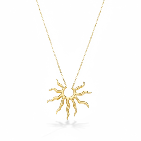 Det lette og elegante design fanger solens varme udtryk på en subtil og raffineret måde. Halskæden måler 47 cm i ltotallængde og har et vedhæng på ca. 4 cm, hvilket giver en smuk visuel balance. Materialet er forgyldt rustfrit stål i høj kvalitet, fri for både nikkel, cadmium og blysalt – et allergivenligt valg, der samtidig holder sig flot i mange år.