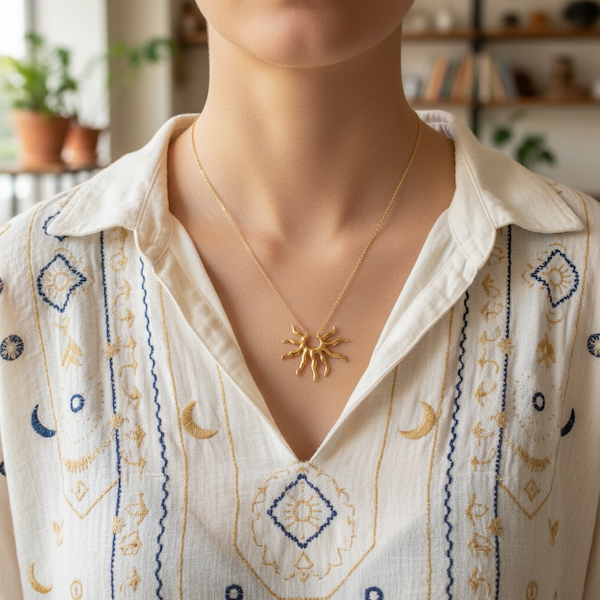 Solens symbolik giver smykket dybde, varme og positiv energi