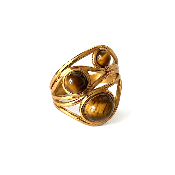 Denne eksklusive justerbare ring i forgyldt rustfrit stål er skabt til dig, der elsker smykker med både skønhed og spirituel mening. Ringen er udsmykket med hele tre smukke tigerøje-sten i harmoniske størrelser, der er placeret i et elegant bølgende design, som snor sig let og feminint hen over fingeren.