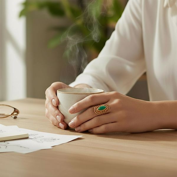 Det organiske og næsten boheme-inspirerede design giver ringen et eksklusivt og feminint udtryk, der passer perfekt til dig, som elsker smykker med spirituel betydning. Kombinationen af den varme guldfarve og den dybgrønne sten skaber en følelse af natur, balance og indre ro – et smykke, der både kan bruges til hverdag og særlige lejligheder.