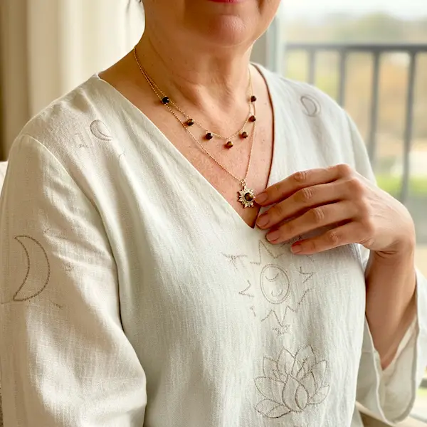 Halskæden har et lag-på-lag-look, der giver dybde og elegance. Den falder smukt over kravebenet og kan både bæres alene som et spirituelt statement eller kombineres med andre kæder for et mere personligt udtryk. Den føles let, men energien er stærk – perfekt til både hverdagsbrug, spirituelt arbejde og særlige øjeblikke, hvor du ønsker ekstra grounding og styrke.