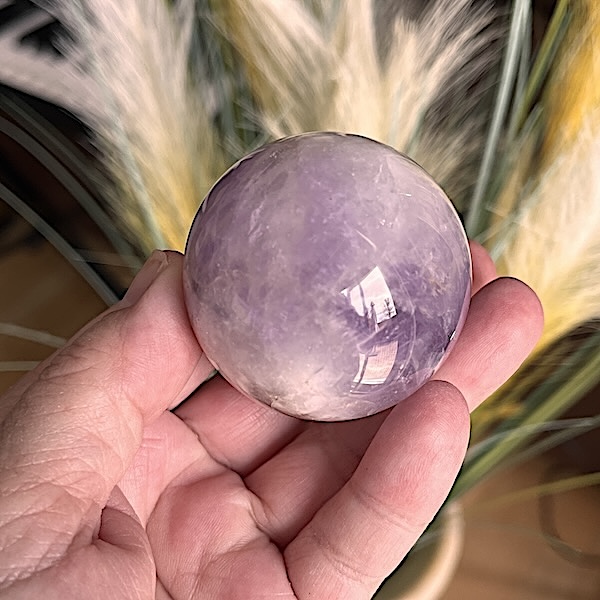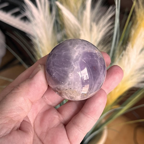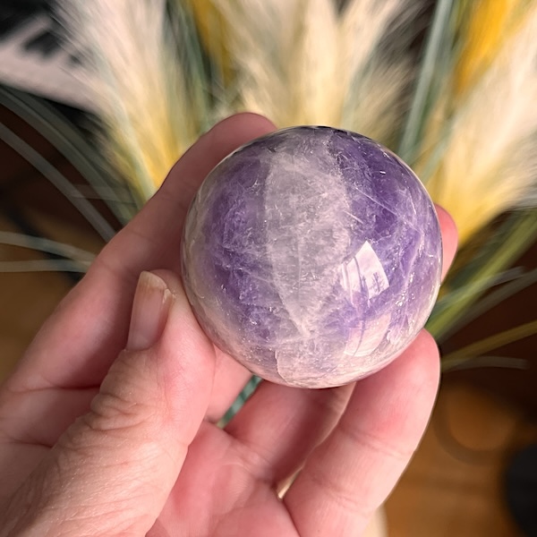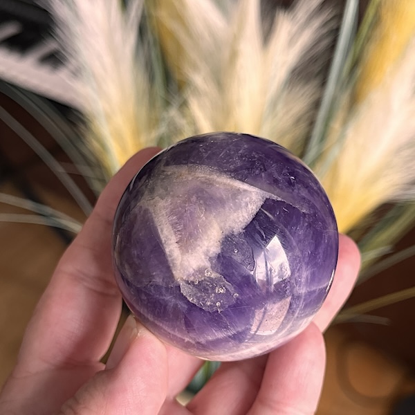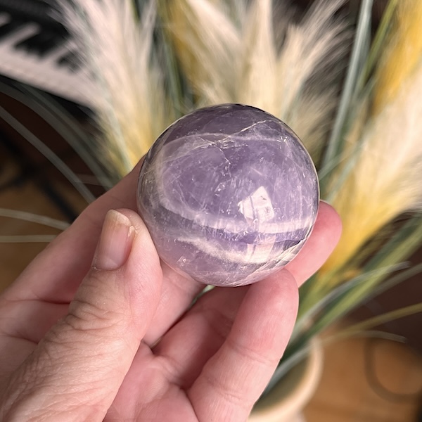 Alle kuglerne er lavet af ægte båndametyst, og det er derfor helt normalt, at nogle har små naturlige fordybninger eller ujævnheder i overfladen. Disse er ikke fejl – tværtimod er de et tegn på stenens naturlige oprindelse og gør hver kugle unik.