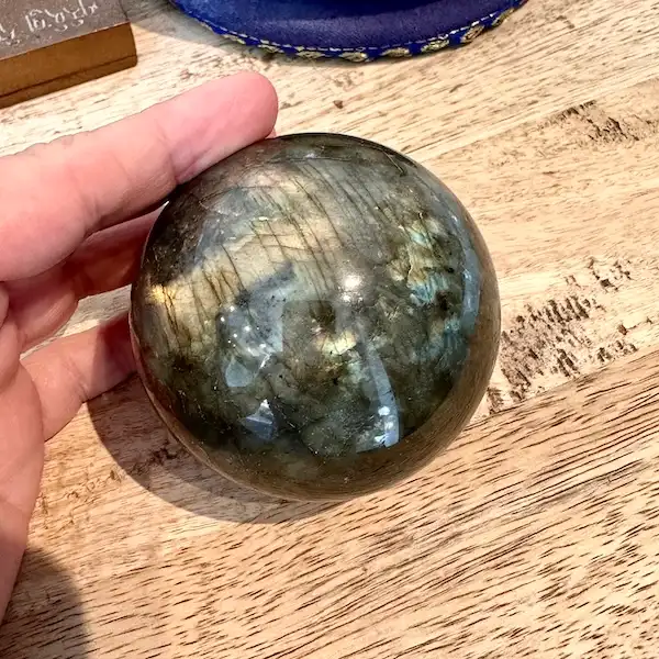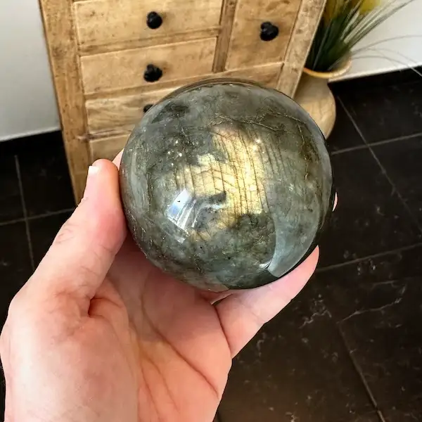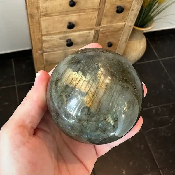 Denne labradorit kugle er ikke bare en smuk dekoration – det er et unikt stykke natur med sin egen energi og sit eget udtryk.