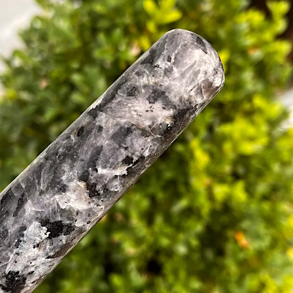Denne healerstav på 11 x 2,6 cm er et alsidigt og kraftfuldt redskab i din spirituelle praksis. Larvikit styrker både rodchakraet og det tredje øje, hvilket gør den ideel til arbejde med jordforbindelse, mental afklaring og spirituel indsigt. Den hjælper dig med at balancere intuition og logik og beskytter mod uønskede energier og overstimulering.