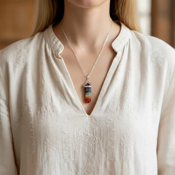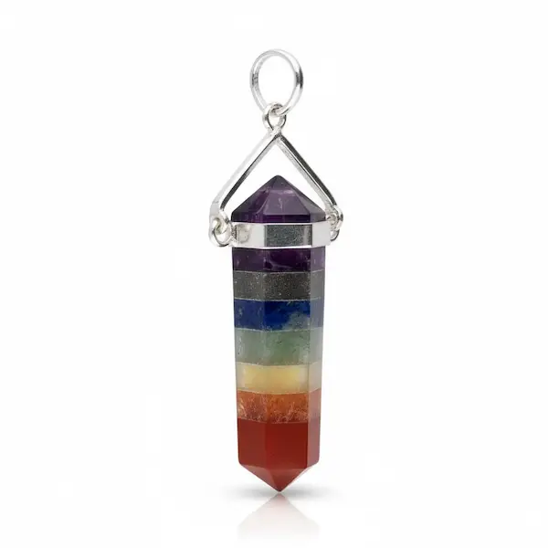 Dette chakravedhæng er sammensat af syv forskellige stentyper, som traditionelt forbindes med kroppens syv chakraer. Kombinationen gør vedhænget ideelt til chakraarbejde, meditation, yoga og energiarbejde.