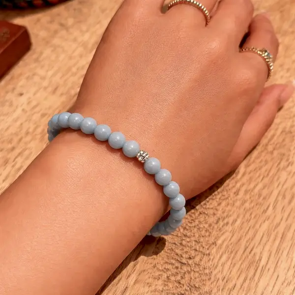 Angelit er kendt som "englesten" og forbindes med fred, harmoni og guddommelig tilstedeværelse. Den arbejder særligt med tredje øje- og halschakraet, hvilket styrker din intuition og evne til klar kommunikation. Når du bærer dette armbånd, kan du opleve en øget indre ro og mental klarhed, som hjælper dig med at navigere gennem hverdagens udfordringer med større lethed og balance.