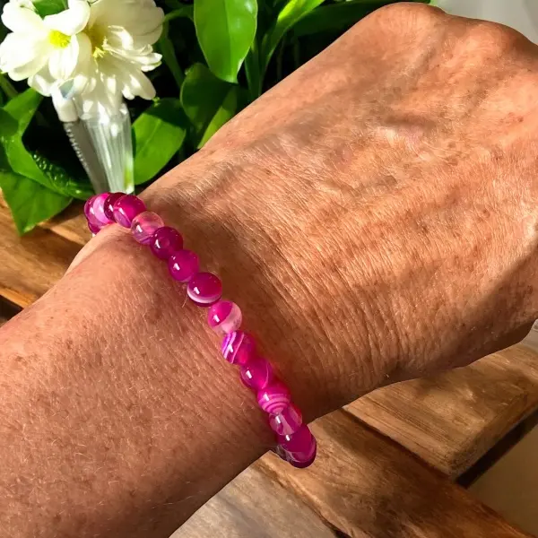 Pink agat er en indfarvet sten. Stenene i disse krystalarmbånd er naturlige og varierer derfor i farve og mønster. Billederne er vejledende, men du vil modtage et smukt krystalarmbånd.