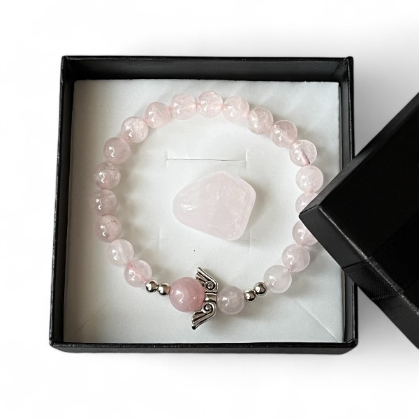 Armbåndet i dette gavesæt er lavet af rosenkvartsperler og prydet med en lille skytsengel, der hænger som et symbol på beskyttelse og kærlighed. Engelens tilstedeværelse gør armbåndet endnu mere meningsfuldt og siges at bringe trøst, balance og harmoni til den, der bærer det. Armbåndet er designet til at passe håndled, der måler mellem 16,5 og 18 cm, hvilket gør det til en alsidig gave, der passer de fleste.