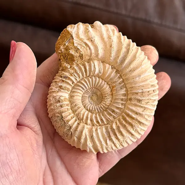 Ammonitten fremstår i varme, sand- og jordfarvede nuancer med en tydelig og velbevaret spiralstruktur og måler 8,1 x 6,7 cm. De fine ribber i fossilet giver et levende og autentisk udtryk, som vidner om dens lange rejse fra fortidens have til nutidens samler- og energiarbejde.