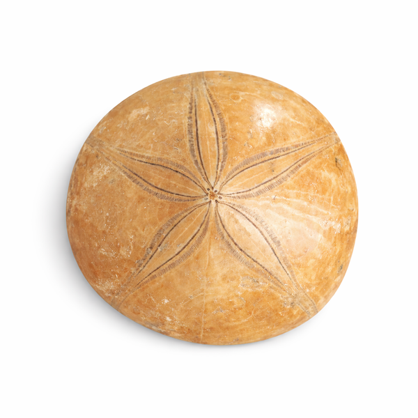Denne smukke Fossil Sand Dollar er et imponerende og velbevaret fossilt søpindsvin med en diameter på 7,3 cm. Med sit tydelige femtakkede stjernemønster og varme, gyldne nuancer er den både et fascinerende naturhistorisk fund og et dekorativt statement.