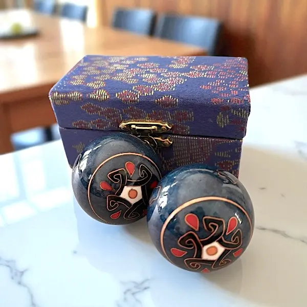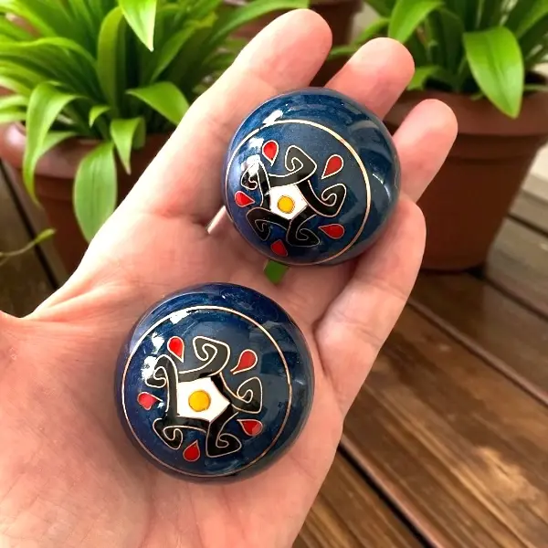 Når kuglerne drejes rundt i hånden, skaber deres indre klokkemekanisme en blød, næsten meditativ lyd. Denne lyd er ikke blot smuk – den fungerer også som et fokuspunkt, der hjælper dig med at være til stede i nuet. Den rytmiske bevægelse af kuglerne virker beroligende for nervesystemet og kan mindske følelsen af stress og uro.
