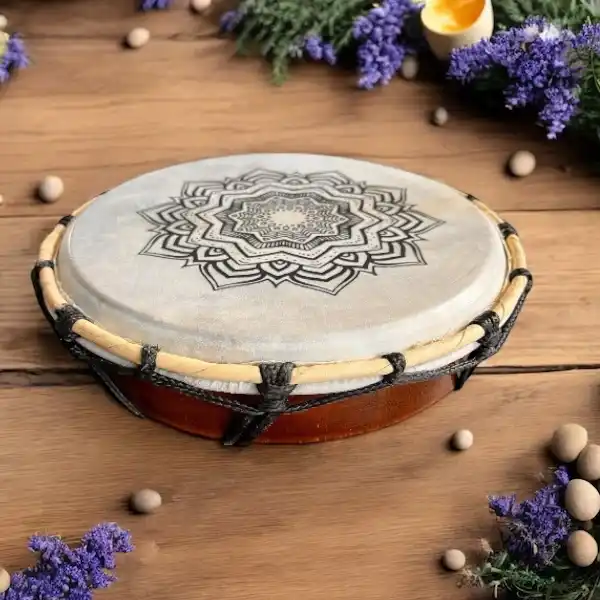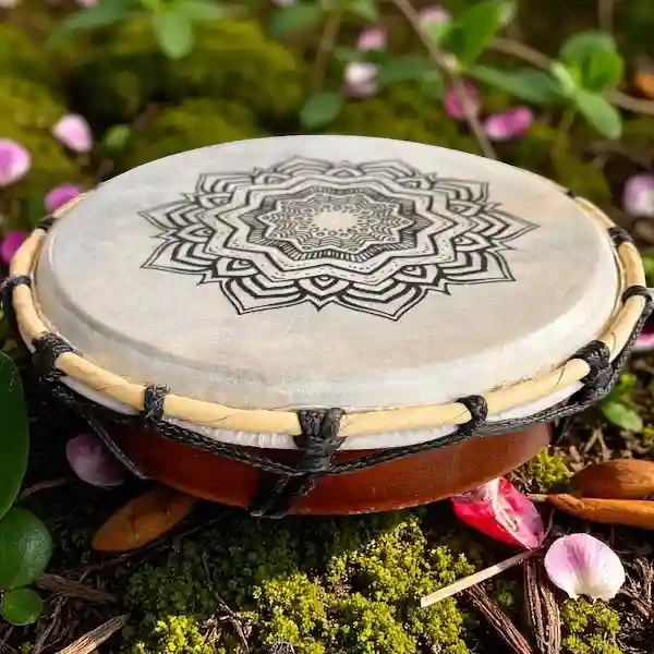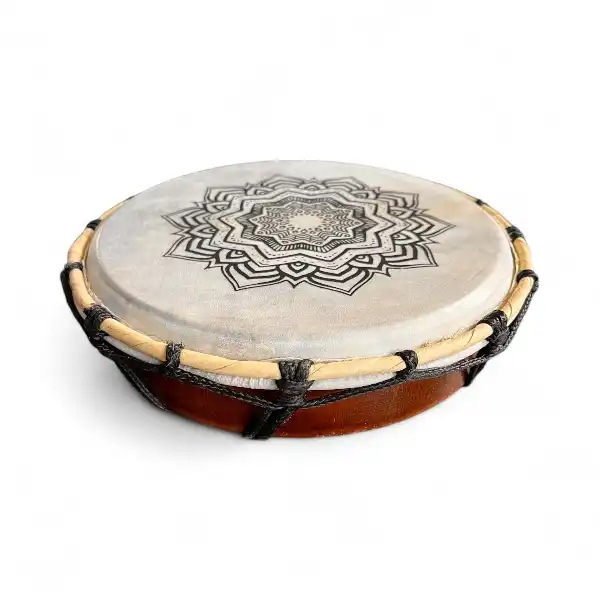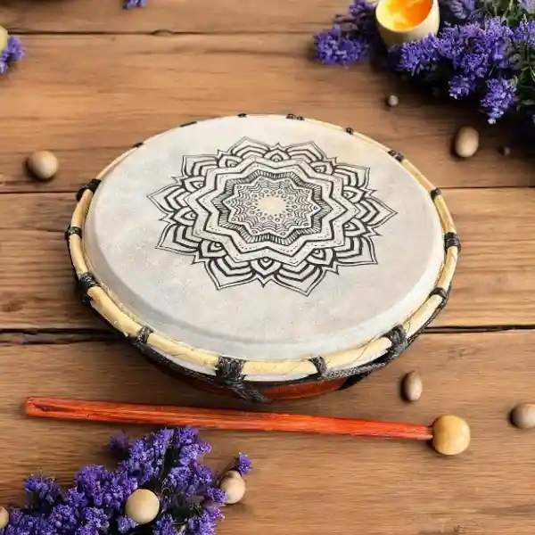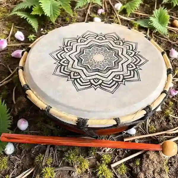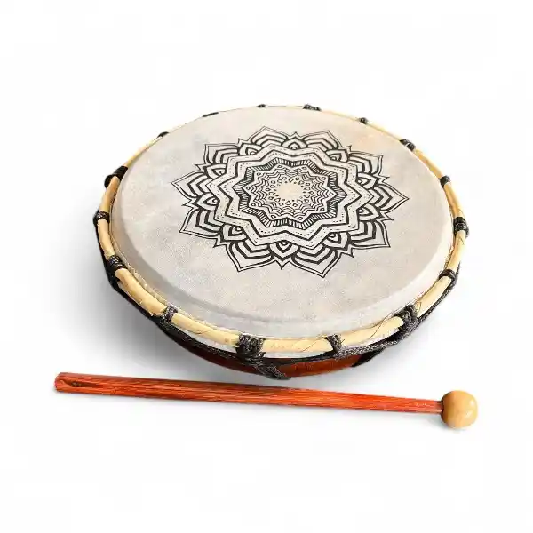 Trommen leveres med 1 stk trommestik i træ, så du kan begynde at spille med det samme. Det unikke mandala-design på trommen tilføjer et spirituelt touch og gør den til et æstetisk smukt instrument, der tiltrækker energi og fokus under ceremonier.