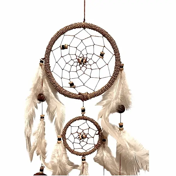 Drømmefangeren er fremstillet af bast og dekoreret med naturfarvede kokosflager, træperler og hvide ægte fjer. Materialerne er nøje udvalgt for deres naturlige udtryk og lette energi, og tilsammen skaber de en harmonisk helhed, der passer perfekt ind i både moderne hjem, boheme-indretning og spirituelle omgivelser.