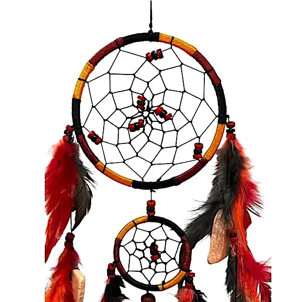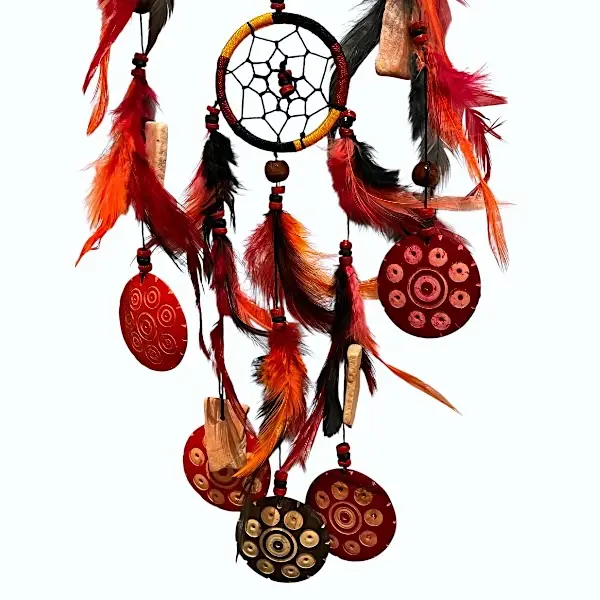 Denne drømmefanger er holdt i varme og kraftfulde farver, som skaber liv, intensitet og balance. Farverne bevæger sig i nuancer af rød, orange, sort og mørke naturtoner, kombineret med jordfarver og naturlige materialer. De ægte fjer varierer i farvespil og struktur og tilfører bevægelse og lethed til det ellers kraftfulde udtryk.
