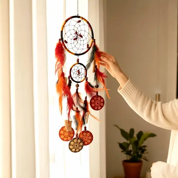Drømmefangeren er fremstillet af tekstil og dekoreret med kokosflager, træperler, ægte fjer og naturlige sten. Farverne er primært rød, orange, sort og jordfarver, som tilsammen skaber et varmt og kraftfuldt udtryk. Produktet er håndlavet i Indonesien, og små variationer i mål, farver og detaljer kan forekomme.